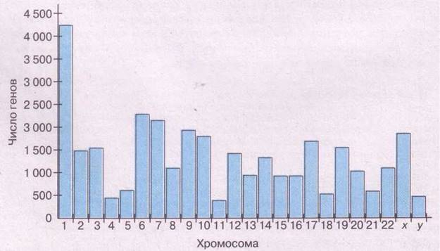 Современные молекулярно-генетические исследования подтвердили эти положения. Реализация программы «Геном человека», в рамках которой исследовалось, какие именно гены расположены в каких именно хромосомах (рис. 39), дала следующие результаты. Было установлено, что каждая хромосома содержит от нескольких сотен до нескольких тысяч структурных генов — всего 32 135 генов. Причём количество генов в хромосоме часто не совпадает с её размерами. Например, 5-я огромная субметацентрическая хромосома несёт только 609 генов, а самая маленькая акро- центрическая 22-я хромосома имеет 1092 гена.