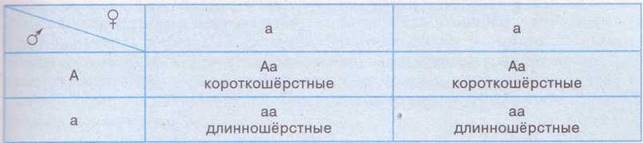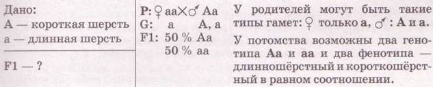 г) в приплоде ожидается два фенотипа котят. Фенотипы котят распределятся так же, как генотипы: котята с генотипом Аа — фенотипически короткошерстные, котята с генотипом аа фенотипически длинношерстные.