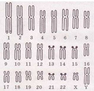 Рис. 58. Расположение ядрышек (чёрные кружки) на хромосомах человека.