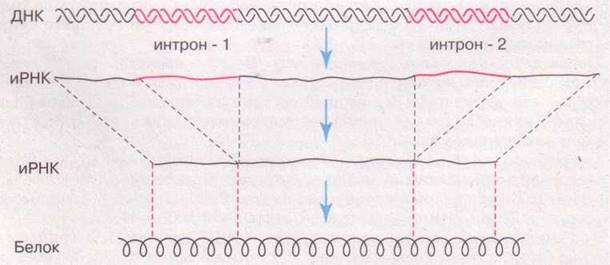 В дальнейшем выяснилось, что, если вся нуклеотидная последовательность ДНК белкового локуса полностью принимает участие в кодировании последовательности иРНК, то не вся первичная иРНК является матрицей для следующего синтеза белка. Часть участков иРНК в процессе её так называемого созревания вырезают специальные ферменты. Остальные сшиваются вместе, образуя вторичную иРНК, из матрицы на которой, собственно и происходит синтез белков.