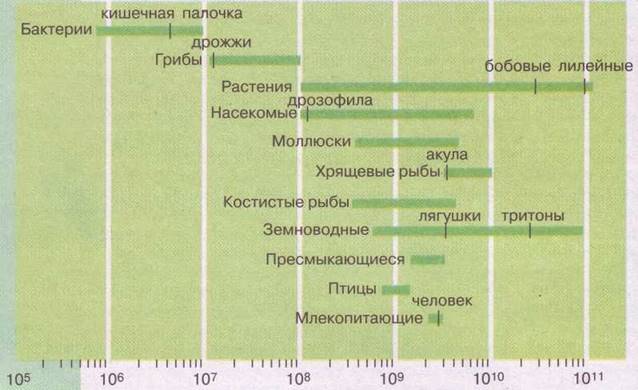 Размер генома, который принято оценивать по количеству ДНК, находящейся в ядре, имеет чёткую тенденцию к увеличению по мере осложнения организации живых организмов (рис. 60). Так, геном бактерии кишечной палочки исчисляется 4,6 млн нуклеотидных пар, геном дрозофилы — 130 млн, геном человека — 3,2 милиарда. Млекопитающие имеют один из самых больших геномов. Но, как известно, из всякого правила есть исключения. Самый крупный геном обнаружен у двоякодышащей рыбы протоптеруса — 130 млрд нуклеотидных пар.