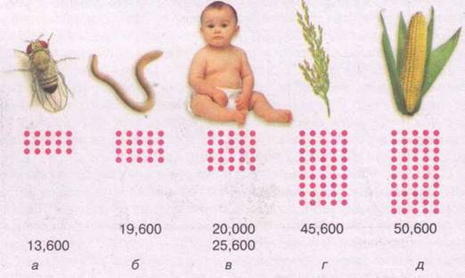 Рис. 61. Число генов у разных групп организмов: а — дрозофилы; б — свободноживущего круглого червя; в — человека; г — риса; д — кукурузы.