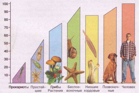 Рис. 62. Процент ДНК, не имеющей отношения к структурным генам: чем выше уровень организации, тем меньший процент ДНК приходится на структурные гены.
