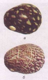 Рис. 65. Изменчивость раковины лунки речной вызвана модификацией генов окраски: пятнистый (а)и полосатый (б) фенотипы.