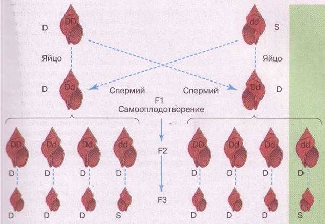 Рис. 68. Схема наследования направления завитка прудовика большого. Фенотипы: D — правосторонний и S — левосторонний; аллели: D — доминантный, определяющий правосторонний завиток, и d — рецессивный, определяющий левосторонний завиток.