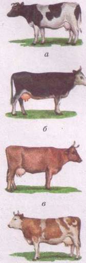 Рис. 73. Породы крупного рогатого скота: а — холмогорская; б — чёрнопёстрая; в — красная степная; г — симментальская отличаются не только по своим биологическим свойствам, но и по фенотипу.
