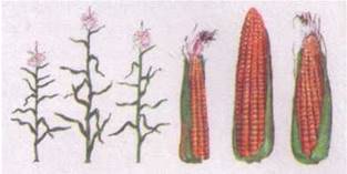 Рис. 76. Гетерозисная кукуруза (в центре) и исходные родительские формы (по бокам).