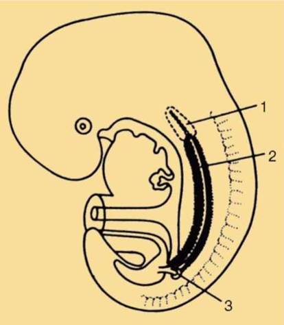 Рис. 14.36. Пятинедельный зародыш человека с тремя поколениями почек: 1 - предпочка; 2 - первичная почка; 3 - вторичная почка