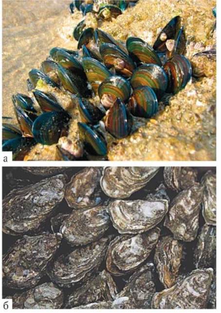 Рис. 23.1. Вторичноядовитые животные: а - мидия съедобная; б - устрица