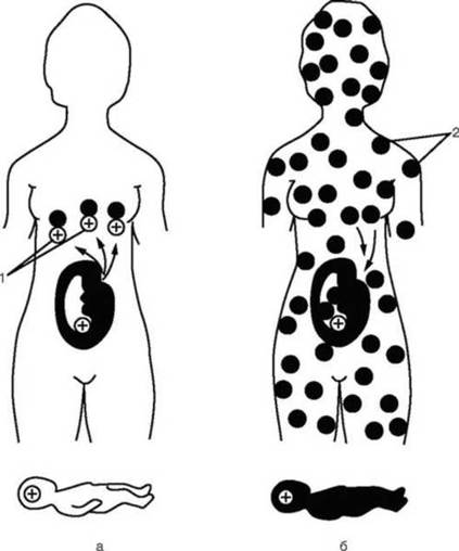 Около 85% населения Европы имеет в эритроцитах антиген Rh и образует группу Rh- положительных индивидуумов. Остальные люди из европейской популяции лишены этого антигена и являются Rh-отрицательными. Синтез антигена Rh контролируется доминантным аллелем D и происходит у лиц с генотипами DD и Dd. Резус-отрицательные люди - рецессивные гомозиготы (dd). При беременности Rh-отрицательной женщины (dd) Rh-положительным плодом (мужчина DD или Dd, плод Dd) при нарушении целостности плаценты в родах Rh-положительные эритроциты плода проникают в организм матери и иммунизируют его (рис. 12-8). При последующей беременности Rh-положительным плодом (Dd) анти Rh антитела проникают через плаценту в организм плода и разрушают его эритроциты. Развивается гемолитическая болезнь новорожденного, ведущий симптом которой - тяжелая анемия.