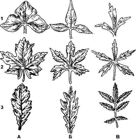 В - рассеченные: 1 – тройчато- 2 - пальчато-; 3 - перисто- (по В. Г. Хржановскому и соавт.)