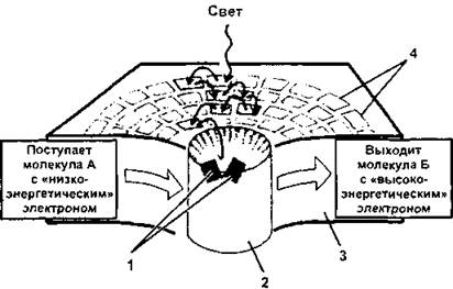 1 - «специальная пара» молекул хлорофилла в реакционном центре; 2 - реакционный центр белково-пигментного комплекса; 3 - мембрана тилакоида; 4 - молекулы хлорофилла в антенном белковом комплексе (по Б. Албертсу и соавт., с изменениями)
