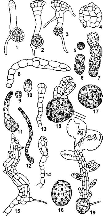 1 —4 - у маршанциевых (Reboulia hemisphaerica); 5 — 8-у метцгериевых (Riccardia miyakeana); 9 - 15 — у юнгерманниевых (Plectocolea radicellata); 16 - 19-у фрулланиееых (Frullania tnincabfolia) (по И. И. Абрамову и соавт.)