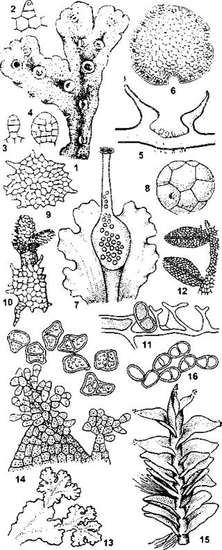 Маршанция (Marchantia polymorphe): 1 - часть слоевища с выводковыми корзиночками; 2-4 - стадии развития выводкового тельца; 5 - выводковая корзиночка в разрезе; 6 — зрелое выводковое тельце. Блазия (Blasia pusilla): 7 - часть слоевища с выводковой колбочкой; 8 - выводковое тельце из колбочки; 9 - звездчатое выводковое тельце с поверхности слоевища; 10 - прорастающее звездчатое выводковое тельце. Рикардия (Riccardia): 11 - эндогенные выводковые тельца. Метцгерия (Metzgeria): 12- выводковые побеги. Пеллия (Реlliа): 13 - выводковые побеги. Сфенолобус (Sphenolobus): 14 - выводковые тельца на листьях. Милия (Mylia anomale): 15- выводковые тельца на листьях; 16- зрелые выводковые тельца (по И. И. Абрамову и соавт.)