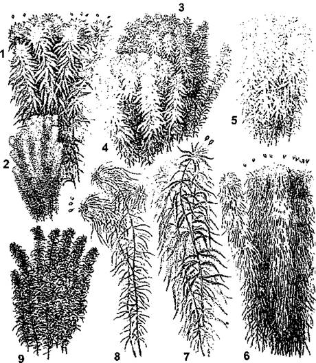1 - сфагнум магелланский (Sphagnum magellanicum); 2 - сфагнум бурый (Sphagnum fuscum); 3 - сфагнум ленский (Sphagnum lenense); 4 - сфагнум Онгстрёма (Sphagnum aongstroemii); 5 - сфагнум балтийский (Sphagnum balticum): 6 - сфагнум дубравный (Sphagnum nemoreum); 7 - сфагнум оттопыренный (Sphagnum squamosum); 8 - сфагнум береговой (Sphagnum riparium); 9 - сфагнум прорезной (Sphagnum perfoliatwn) (по «Жизнь растений», т. 4)