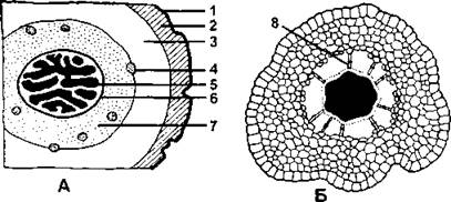 А - срез стебля плауна булавовидного (Lycopodium clavatum): 1 - эпидерма; 2 - внешняя кора; 3 - срединная кора; 4 - листовой след; 5 - проводящие элементы ксилемы; 6 - эндодерма; 7 - внутренняя кора; Б - срез стебля селагинеллы селаговидной (Selaginella selaginoides); 8 - трабекула (по В. Р. Филину)
