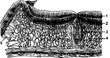 1 - верхний палисадный эпидермис: 2 - нижний палисадный эпидермис; 3 - трахеидный остров; 4 - астероидная ткань: 5 - гиподерма (по В. Г. Александрову)