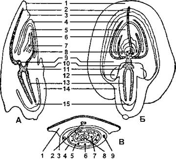 1 - щиток; 2 - проваскулярный пучок, идущий в щитке; 3 - брюшная чешуйка-лигула; 4 - колеоптиль; 5 - первый лист почечки; 6 - проваскулярный пучок первого листа почечки: 7 - второй зачаточный лист почечки; 8 - точка роста; 9 - прозаскулярные пучки колеоптиля и место присоединения их к проваскулярному пучку щитка; 10 - эпибласт; 11 - узел; 12- первая пара добавочных зародышевых корешков; 13 - проваскулярная система центрального корешка; 14 - колеориза; 15 - центральный зародышевый корешок (по Яковлеву)