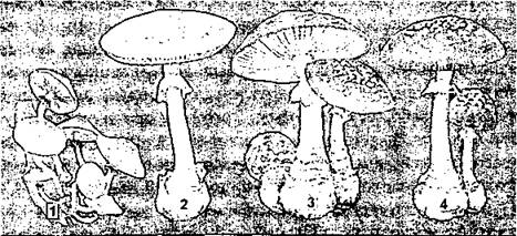 1 - ложные опята; 2 - бледная поганка; 3 — красный мухомор; 4 - пантерный мухомор (по А. И. Купцову)