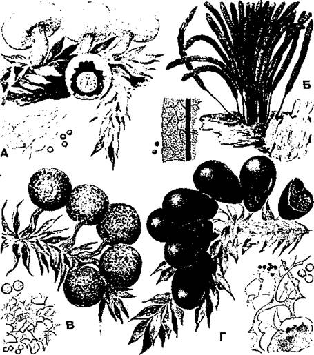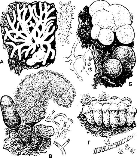 Д - губчатые комочки спор возбудителя порошистой парши картофеля в тканях клубня (по Т. П. Сизовой (А, В, Г, Д) и Н. А. Комарницкому и соавт. (Б))