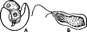 Для успешного прорастания споры прежде всего необходима вода. В жидкой среде из споры через имеющиеся поры оболочки или при ее разрыве выходит одна, чаще две, а иногда четыре или даже восемь зооспор, снабженных двумя жгутиками неравной длины (рис. 404). Если спора прорастает не в жидкости, а на увлажненном субстрате, то из нее выходят не зооспоры, а амебовидные организмы, которые называются миксамебами (греч. туха - слизь, amoibe - изменение). И зооспоры и миксамебы размножаются бесполым путем (делением клеток), увеличивая таким образом свою численность.