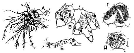 Рис. 406. Кила капусты (А, Б, В, Г) и порошистая парша картофеля (Д):