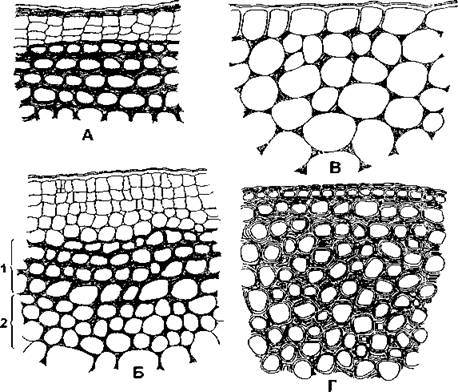 Г — рыхлая колленхима в черешке листа лопуха большого (Arctium platylhepis) (по В. X. Тутаюк)