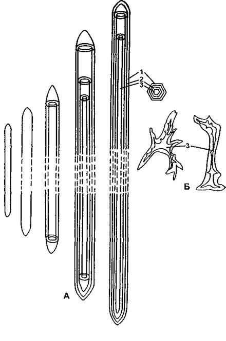 А - поперечный срез: 1 - оболочка волокна; 2 - полость волокна;