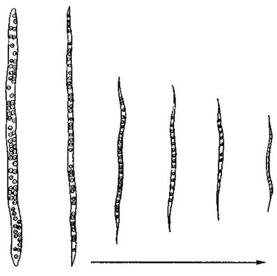 Рис. 56. Изменения структуры ксилемных волокон с точки зрения теории эволюции. Изменения состоят в сокращении длины волокон, в уменьшении размеров окаймления и отверстий пор I (по А. А. Яценко-Хмелевскому)