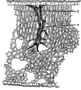 1 - утолщенная и одревесневшая стенка опорной клетки; 2 - полость опорной клетки (по В. X. Тутаюк)
