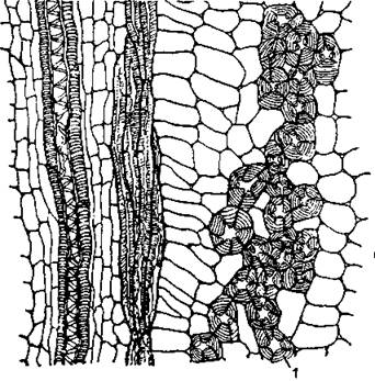 Рис. 58. Каменистые клетки (1) в мякоти плода маньчжурской яблони, расположенные тяжем, идущим параллельно сосудистой системе и лубяным волокнам (по В. Г. Александрову)