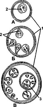 А - цистицерк: Б - ценур; В - эхинококк; 1 - стенка пузыря финны; 2 - ввернутые головки: 3 - почкование головок в дочерних пузырях (по Скрябину и Шульцу)