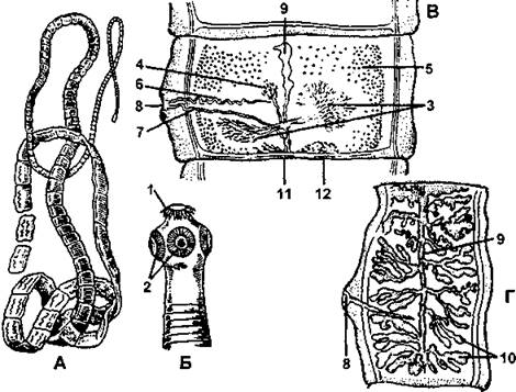 А - стробила: Б - скопекс; В - гермафродитная проглоттида; Г - зрелая проглоттида; 1 - крючья на скопексе; 2 - присоски; 3 - яичник; 4 - третья (добавочная) долька яичника: 5 - семенники; 6 - семяпровод; 7 - влагалище; 8 - циррусная сумка; 9 - главный ствол матки; 10 - боковые ответвления матки; 11 - тельца Мелиса; 12- желточник (по А. А. Спюсареву и соавт.)