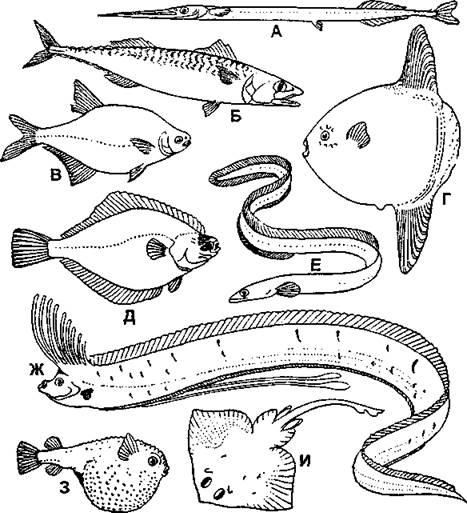 А - стреловидный (сарган); Б - торпедовидный (скумбрия); В - сплющенный с боков, лещевидный (лещ обыкновенный); Г - тип рыбы луны (луна-рыба); Д - тип камбалы (речная камбала); Е - змеевидный (угорь); Ж - лентовидный (сельдяной король); З - шаровидный (кузовок); И - плоский (скат) (A-З- костные, И - хрящевая рыбы) (по Б. С. Матвееву и совет.)