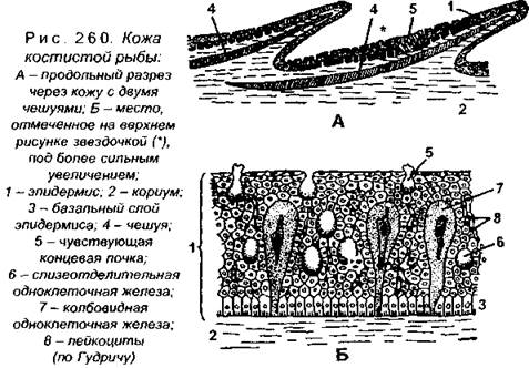 Анатомия. Покровы тела, так же как и у хрящевых рыб, представлены кожей с чешуей. Кожа состоит из многослойного эпидермиса и нижележащей плотной дермы. В эпидермисе имеются многочисленные одноклеточные железы, выделяющие слизь (рис. 260). Наружный слой эпидермиса оро- говевает, но не отмирает и сохраняет связь с живыми клетками. У многих видов (например, у сиговых, карповых и др.) перед нерестом степень ороговения покровов увеличивается, а затем восстанавливается (рис. 261).