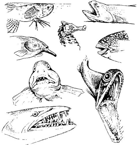 Из меккелева хряща, который у хрящевых рыб служит нижней челюстью, образуется первичная сочленовная кость, однако у костных рыб она лишь образует челюстной сустав с квадратной костью верхней челюсти. Основную же часть нижней челюсти составляют парные вторичные кости: крупная зубная кость, которая покрывает часть сочленовной кости, и мелкая угловая кость (она сзади соединяется с сочленовной костью). Таким образом, первичные челюсти костных рыб (т.е. кости, возникшие из нёбно-квадратного и меккелева хрящей) образуют челюстной сустав, тогда как непосредственно челюсти образованы вторичными костями. Наличие вторичных челюстей позволяет значительно разнообразить способы захвата и удержания пищи, приспосабливаться к определенному типу пищи, именно этим можно объяснить различные формы ротового аппарата и, соответственно, видовое разнообразие (рис. 269). Это выгодно отличает костных рыб от хрящевых, ротовой аппарат которых устроен однотипно, и поэтому они не способны потреблять такую разнообразную пищу, как различные виды костных рыб.