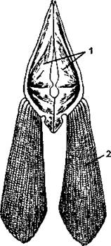 Рис. 272. Тазовый пояс и брюшной плавник судака: 1 - тазовые кости; 2 - кожные костные лучи (по H. Н. Карташеву и совет.)