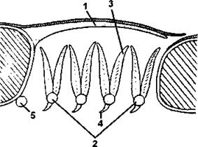 1 - жаберная крышка; 2 - жаберные дуги; 3 - жаберные лепестки; 4 - жаберные тычинки; 5 - подъязычная дуга (по С. И. Левушкину и соавт.)