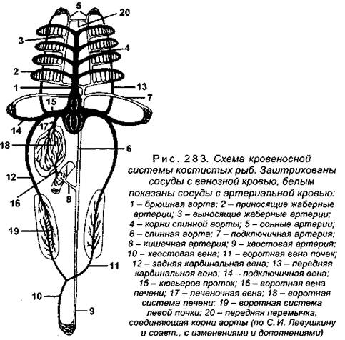 Кровеносная система во многом сходна с хрящевыми рыбами (рис. 283), поэтому мы не будем ее рассматривать целиком, а остановимся лишь на особенностях.