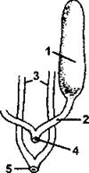 Рис. 286. Мочеполовой аппарат самок костистых рыб: 1 - яичник; 2 - яйцевод: 3 - мочеточник; 4 - половые отверстия; 5 - мочевое отверстие (по Шмальгаузену)