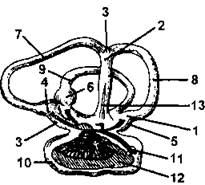 1 - овальный мешочек; 2 - верхний синус мешочка; 3 - верхушка мешочка; 4, 5 и 6 - ампулы полукружных каналов; 7, 8 и 9 - полукружные каналы; 10 - круглый мешочек; 11 - ветви слухового нерва; 12- отолит; 13 - эндолимфатический проток (по Суворову)