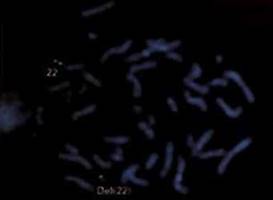Рис. 9-1. ДНК-верификация делеции длинного плеча хромосомы 22 методом флюоресцентной гибридизации in situ (FISH): в одной хромосоме 22 — две метки, в другой — одна метка.