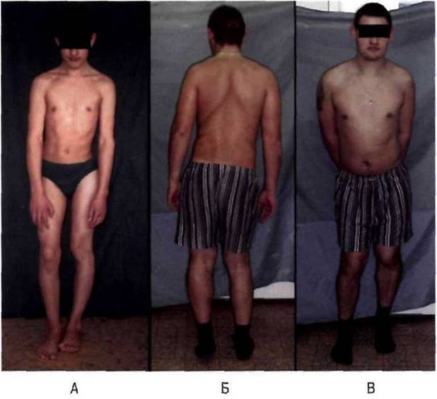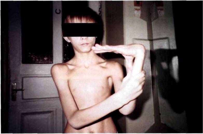 Рис. 13-1. Дисплазия соединительной ткани с марфаноидным фенотипом (гипермобильность суставов, долихостеномелия, арахнодактилия, астеническое телосложение).