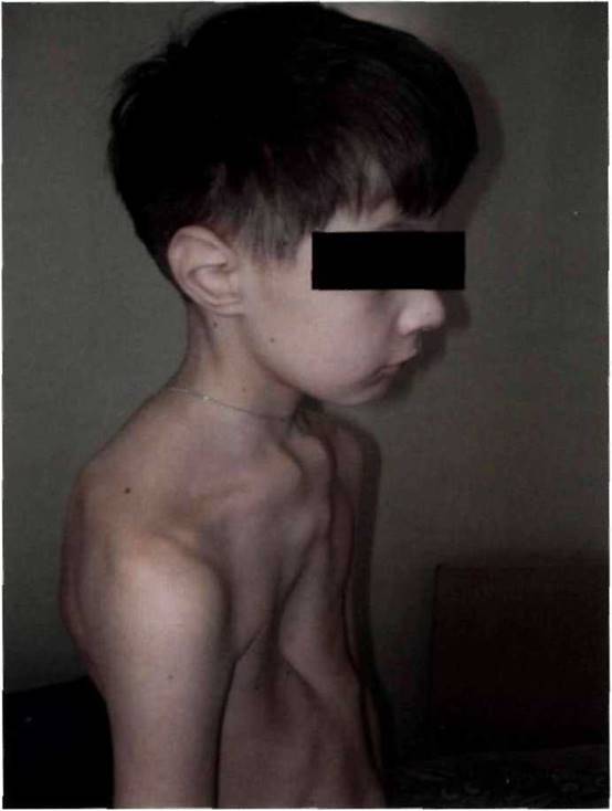 Рис. 13-2. Дисплазия соединительной ткани с неклассифицируемым фенотипом (воронковая деформация грудной клетки, кифоз, долихоцефалия, деформация ушных раковин).