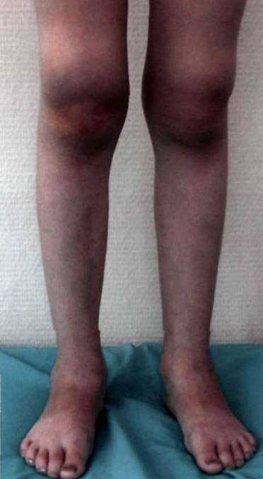 Рис. 23-2. Типичное поражение суставов при ювенильном спондилоартрите - артриты коленных, голеностопных, суставов предплюсны.