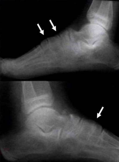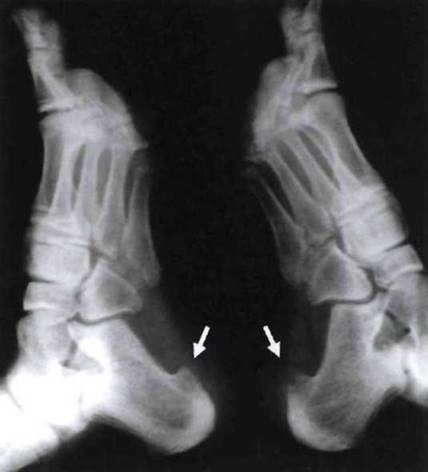Рис. 23-11, Остеофиты в месте фиксации плантарной фасции к нижним краям пяточных бугров (указано стрелками) у больного ЮАС.