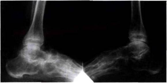 Рис. 23-6. Рентгенограмма стоп больного ювенильным анкилозирующим спонилоартритом: «анкилозирующий тарзит».