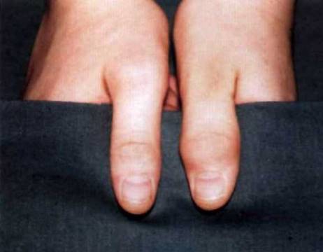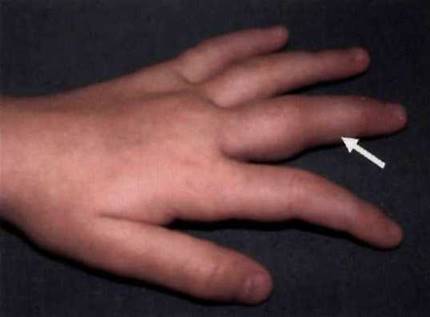 Рис. 23-13. Дактилит («сосискообразная» дефигурация) 3-го пальца кисти.