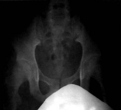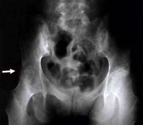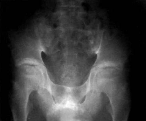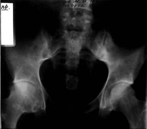 Рис. 23-8. Деструктивный коксит с формированием анкилоза правого тазобедренного сустава у больной ЮАС.