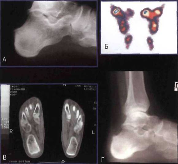 Рис. 23-12. Эрозии пяточной кости у больного ЮАС: А - рентгенограмма; Б - сцинтиграфическое исследование (значительное накопление радиофармпрепарата справа); В - компьютерная томография; Г - прогрессирование рентгенологических изменений с формированием остеофитов верхнего и нижнего краёв пяточной кости при исследовании в динамике через 4 года.